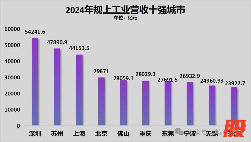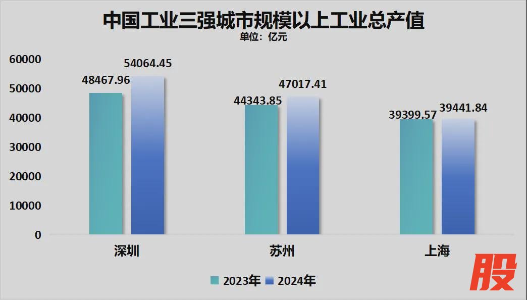 作为中国工业第一城,2024年深圳的规模以上工业总产值冲破了5万亿,高达5.4万亿,与工业第二城苏州、第三城上海之间,形成了断崖式的领先地位。